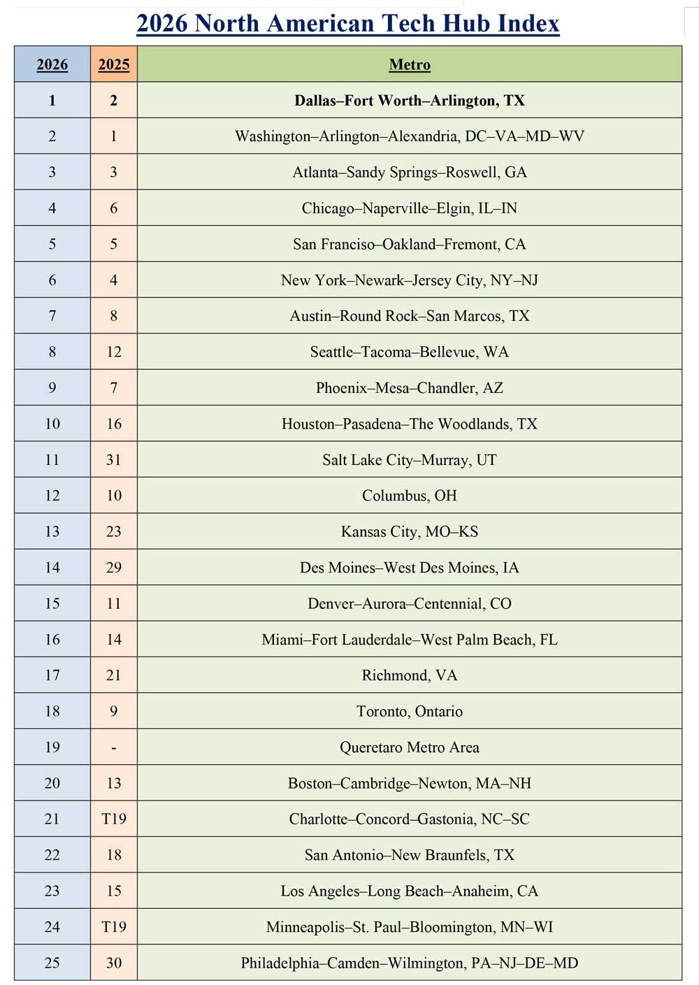 Interesting to see some relatively large position moves among the long-time stalwarts, and a few overall surprises as well! The real magic lies in finding the next great city for tech. Stay tuned. Related PostsThe Best States for Manufacturing Projects Right NowJanuary 27, 2026Critical Refinancing Tests LoomJanuary 15, 2026Top Metro Areas for Life Sciences in the Southeast by Number of ProjectsDecember 30, 20252025 Top State Business Climate RankingsDecember 30, 2025Values Plummet for Distressed Office PropertiesOctober 27, 2025Top 25 Lowest-Cost Manufacturing Locations in the USJuly 25, 2025